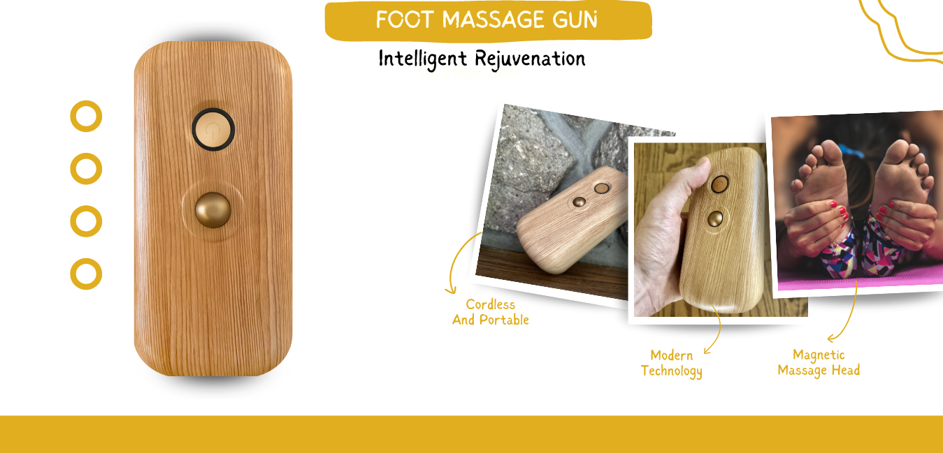 Patented proven device designed specifically to revitalize weary feet with two effective massages.